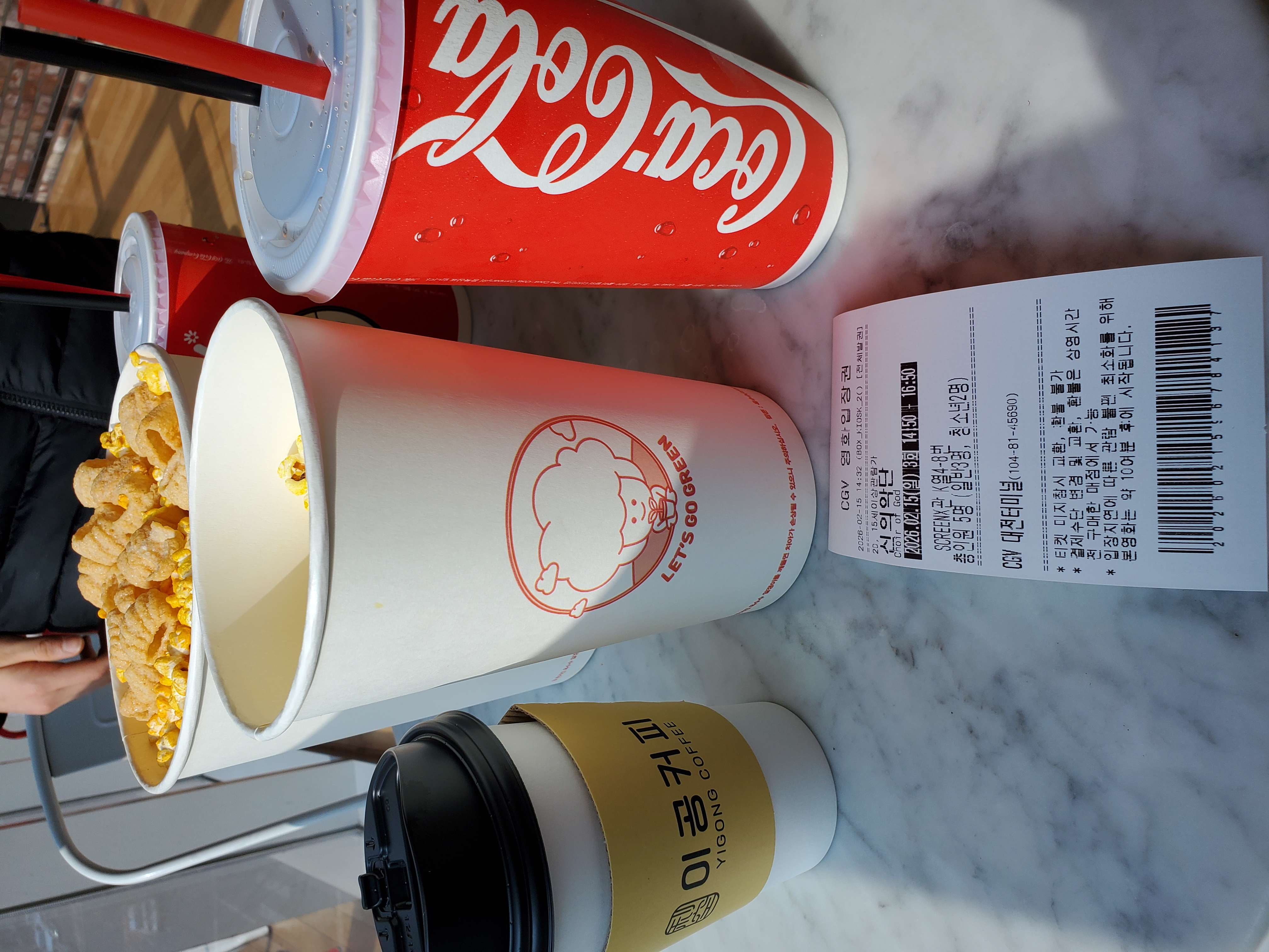 장모님이 사주신 커다란 팝콘과 음료수를 들고